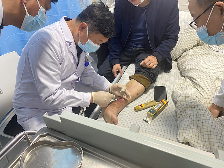 张强教授应湖北省宜昌市夷陵人民医院邀请,会诊一例右脚底三度烧伤患者