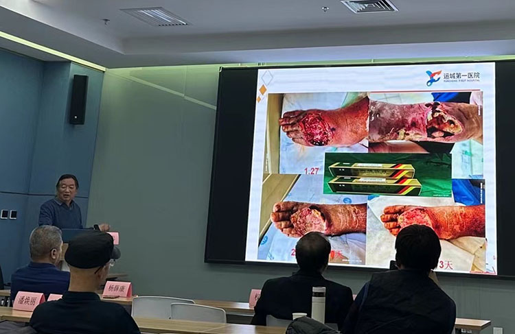 12月12日,《中国烧伤创疡杂志》编委、烧伤创疡再生医疗技术临床专家张强教授,应华中科技大学协和东西湖医院血管外科章万勇主任邀请,开展了《再生医疗技术在难治性创疡的治疗》的培训讲座,张教授分享了下肢动静脉溃疡、糖尿病性足部溃疡通过开通血管,局部采用再生医疗技术治疗应注意的要点和细节问题。随后到病房会诊了一例大隐静脉曲张引起的下肢末端溃疡病人,张教授还亲自示范规范换药及注意事项,并针对后期的治疗方案提出可操作性建议!
